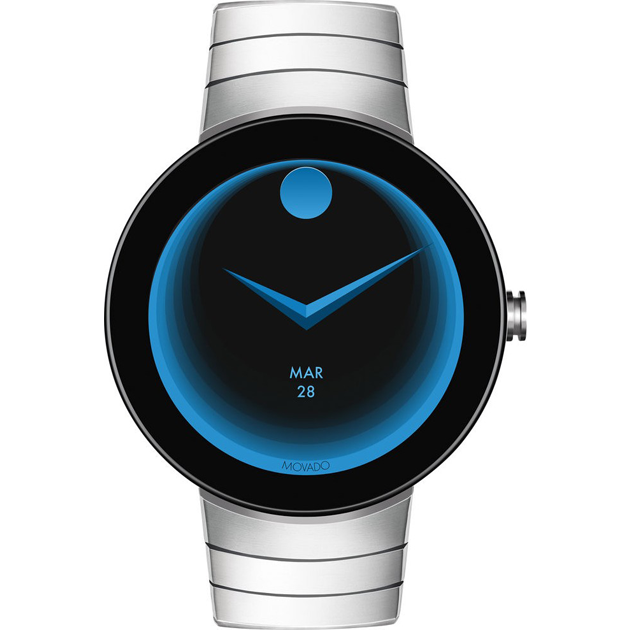 Movado Connect smartwatch, powered by Android Wear™, Android/iOS compatible, 46.5 mm stainless steel case, round digital dial with edge to edge crystal, features over 100 customizable dial variations, displays phone call, appointment, email, Google Fit, apps, music, text and social media messages; equipped with Google Assistant; NFC enabled; charging cable for smart module; stainless steel bracelet with a push button deployment clasp.