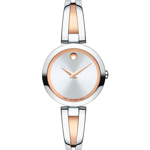 Women’s Aleena watch, 27 mm stainless steel case, stainless steel dial with red gold PVD-finished inner circle, with red gold-toned dot and hands, stainless steel and red gold PVD-finished bangle-style bracelet and jewelry clasp.