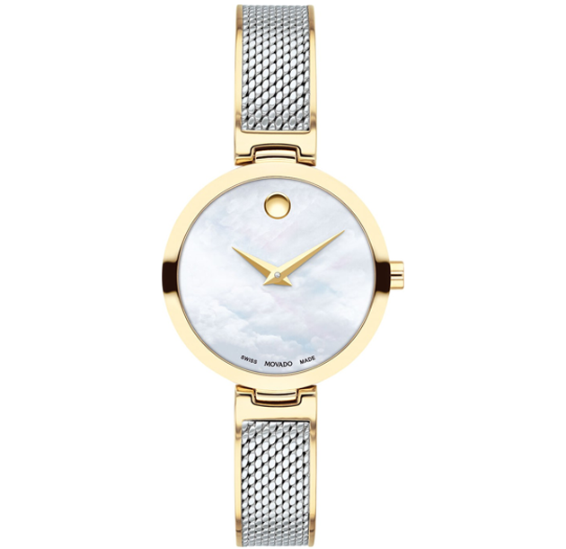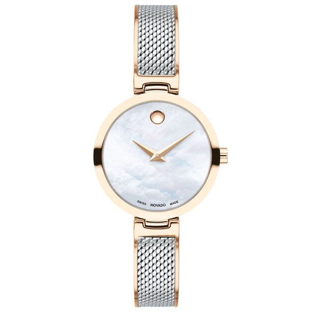 Movado Amika, 27 mm stainless steel case and mesh bangle with white mother of pearl dial.