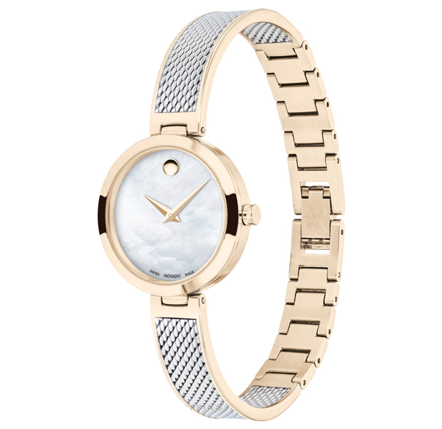 Movado Amika, 27 mm stainless steel and pale rose gold PVD-finished stainless steel case and mesh bangle with white mother of pearl dial.