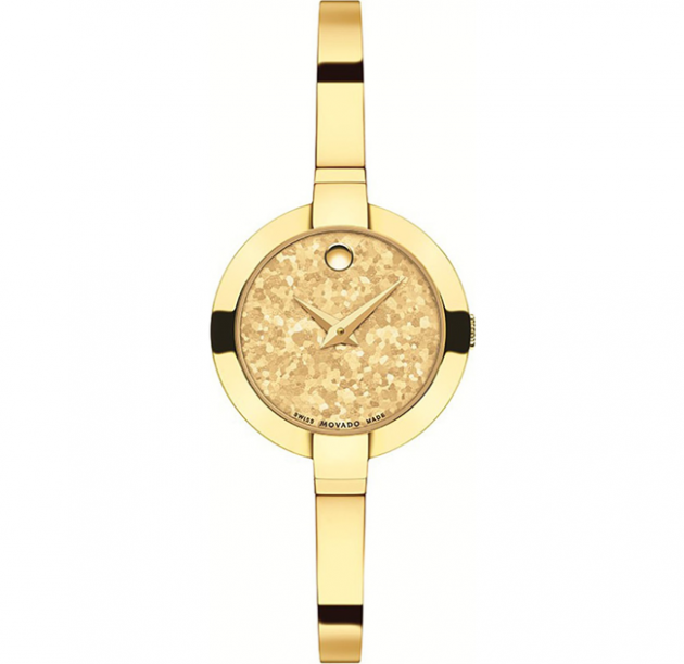Women’s Bela watch, 25 mm yellow gold PVD-finished stainless steel case, innovative yellow gold-plated crystalized titanium Museum dial with gold-toned dot and hands, slender yellow gold PVD-finished stainless steel bangle-style bracelet with back sizing links and jewelry clasp.
