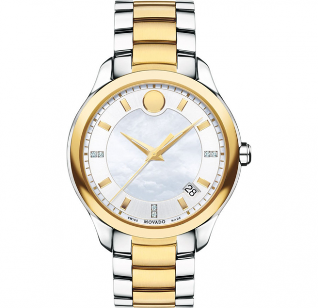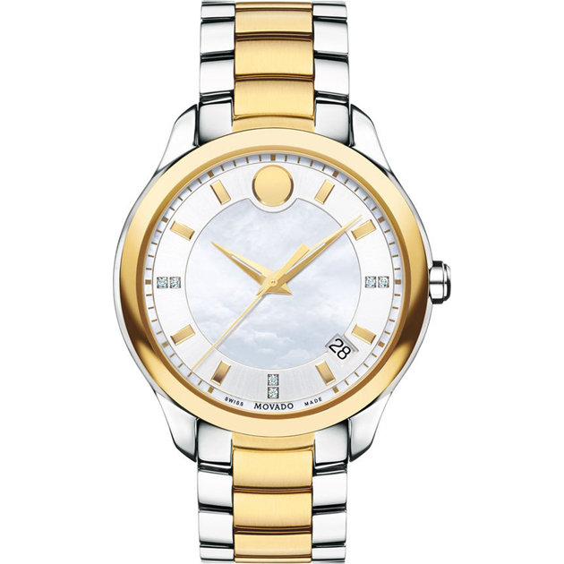 Bask in the brilliance of this timepiece by Movado, featuring both stunning silver and gorgeous gold tones. From the Bellina collection. Mother-of-pearl dial with diamond accent markers, gold-tone stick indices, flat signature dot at the 12hr mark, three hands and date window.