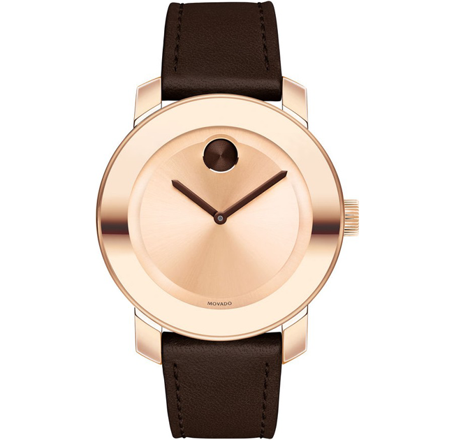 White TR90 composite material case with a white leather strap with purple lining. Fixed bezel. White dial with pink hands. No markers. Movado pink dot marks the 12 o’clock position. Dial Type: Analog. Swiss quartz movement. Scratch resistant K1 crystal. Pull / push crown. Solid case back. Case diameter: 36 mm. Round case shape. Tang clasp. Water resistant at 30 meters / 100 feet. Functions: hour, minute. Casual watch style. Movado Bold White Dial Pink Accents White Leather Ladies Watch 3600177.