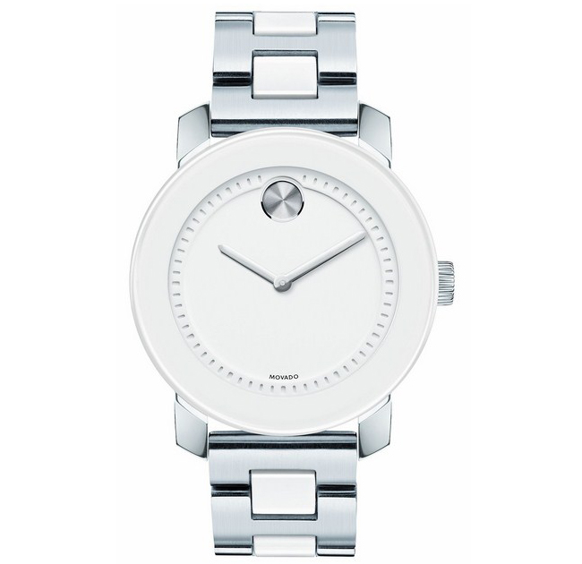 White ceramic and stainless steel case with a white ceramic bracelet. Fixed white ceramic bezel. White dial with white hands and stick hour markers. Movado dot marks the 12 o’clock position. Minute markers around the outer rim.