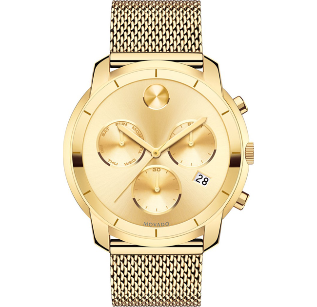 As exquisite as your favorite bangle, this Bold watch from Movado radiates timeless elegance. Rose gold ion-plated stainless steel bangle bracelet with removable links and deployment clasp. Round case, 34mm, K1 crystal with rose gold-tone metallization Rose gold-tone sunray dial with two hands and Swarovski element dot marker at twelve o’clock