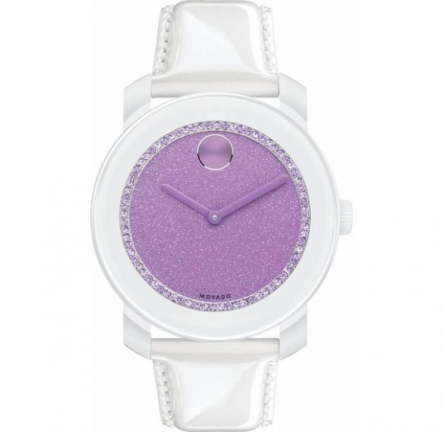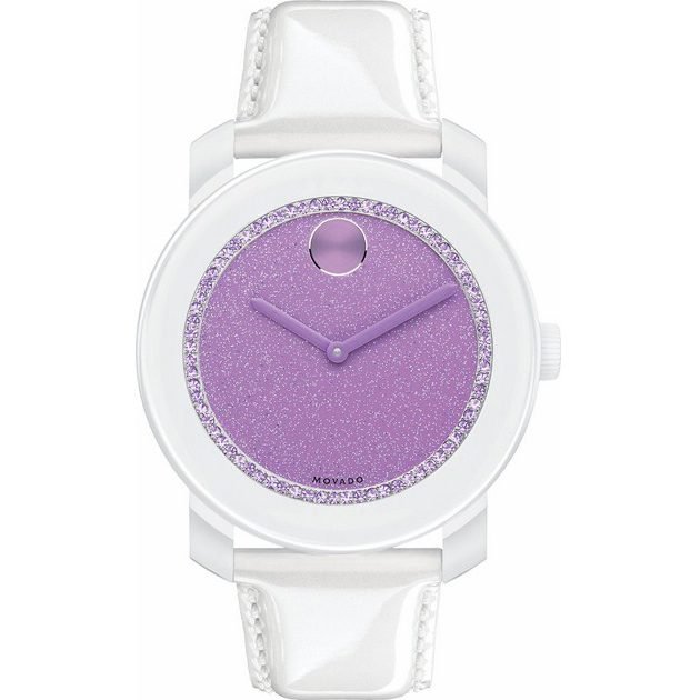 The Bold watch collection features all the sophistication of Movado, energized with a new attitude and pop of colorful sparkle. White pearlized patent leather strap with purple lining and stainless steel tongue buckle. Round white TR90 composite material and stainless steel case, 42mm, K1 crystal. Lavendar shimmer dial with Swarovski element outer ring and two hands