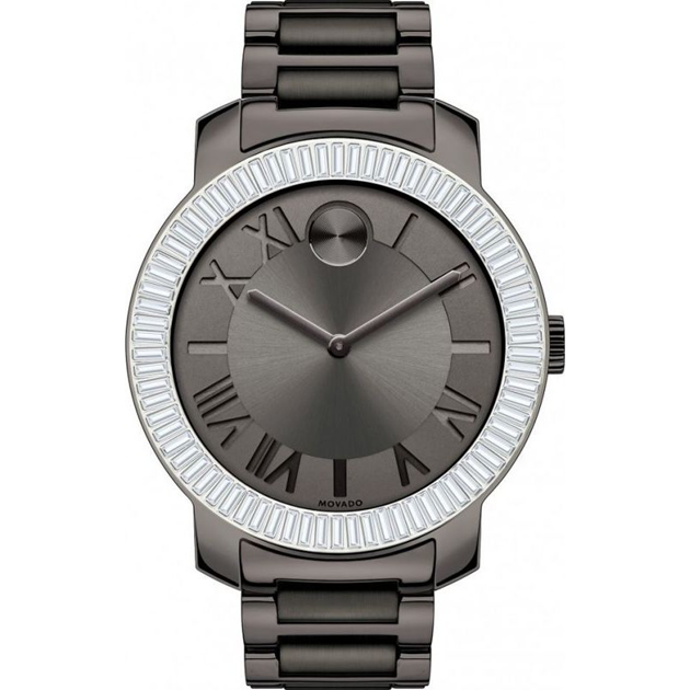 Gunmetal ion-plated stainless steel case and bracelet. Fixed gunmetal ion-plated bezel set with bauggete crystals. Gunmetal dial with gunmetal hands and Roman numeral hour markers. The Movado dot appears at the 12 o’clock position.