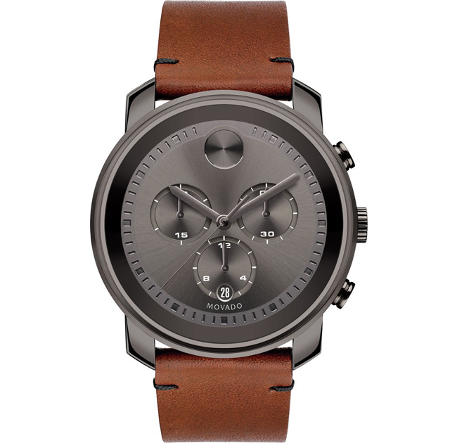 A rustic leather strap introduces a casual feature to Movado’s modern Bold collection watch. Black rustic leather strap with stitch detail and black ion-plated stainless steel buckle. Round black TR90 composite material and stainless steel case, 42mm, K1 crystal.