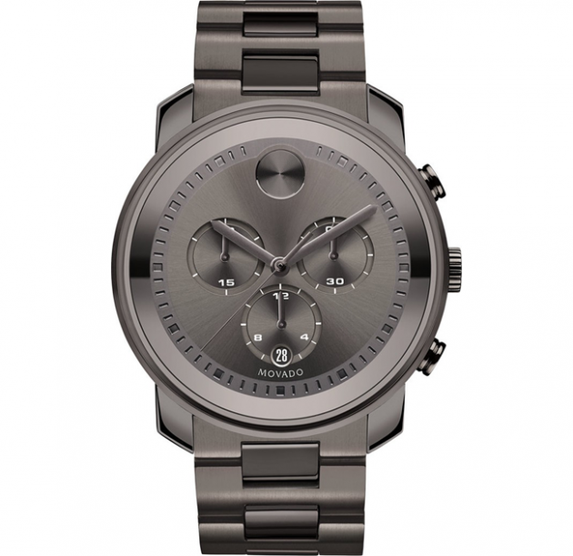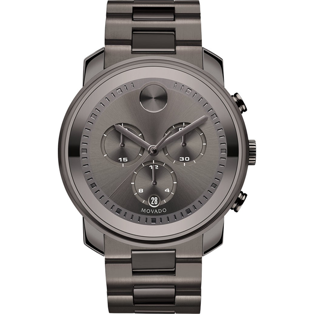 The Bold watch collection features all the sophistication of Movado with ultra-contemporary styling. Gunmetal ion-plated stainless steel bracelet with push-button deployant clasp. Round case, 44mm, K1 crystal. Gunmetal-tone chronograph dial with stamped minute track, sunray dot marker, three hands, three subdials and date window