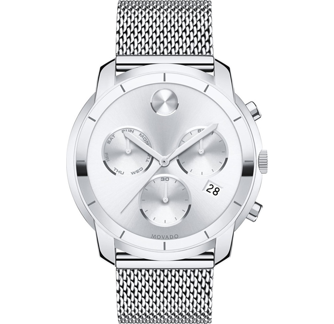 Monochromatic modernism. This unisex watch from Movado takes elegant to a whole new level with its rich blue hue and sleek design. Blue ion-plated stainless steel link bracelet with push-button deployant clasp. Round case, 44mm, K1 crystal. Dark navy chronograph dial with hands, date window, subdials, dot marker and logo