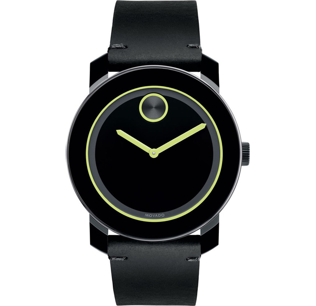 Complementary and rustic color covers Movado’s Bold collection timepiece. Rustic brown leather strap with black ion-plated stainless steel buckle closure; strap width: 22mm; length: 200mm