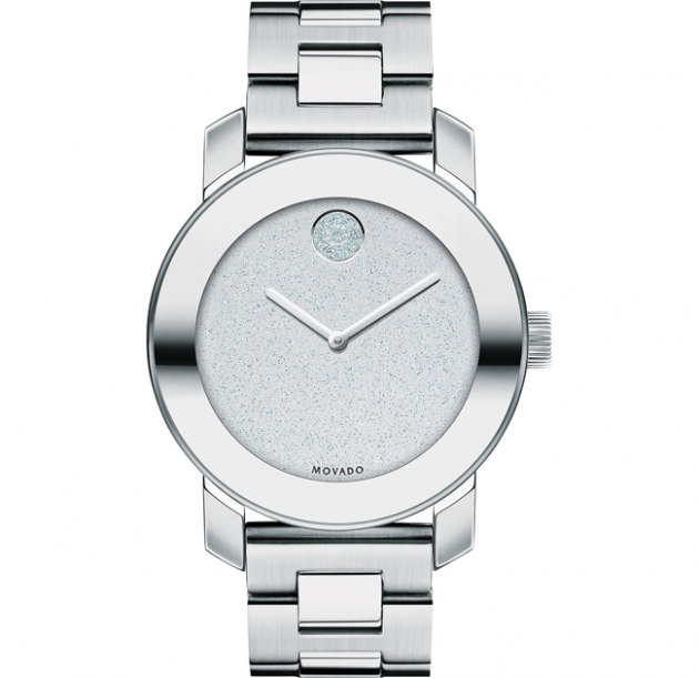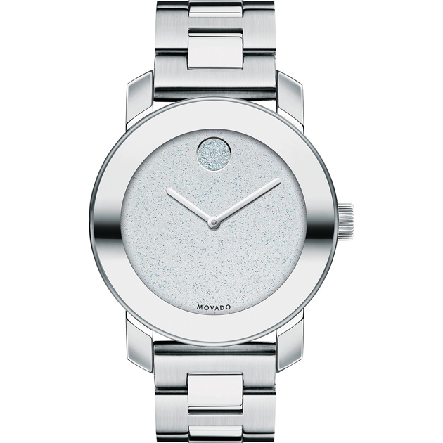 A burst of glamorous energy on a classic watch silhouette: the Bold collection by Movado. Stainless steel link bracelet with push-button deployant clasp. Round case, 36mm, K1 crystal. Silver-tone glitter dial with two hands and crystal dot marker