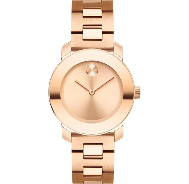 This wonderful watch by Movado features beautiful blush tones with a unique crackle glitter dial. From the Bold collection. Rose gold-tone crackle glitter dial with signature dot at twelve o’clock, two hands and Movado logo.