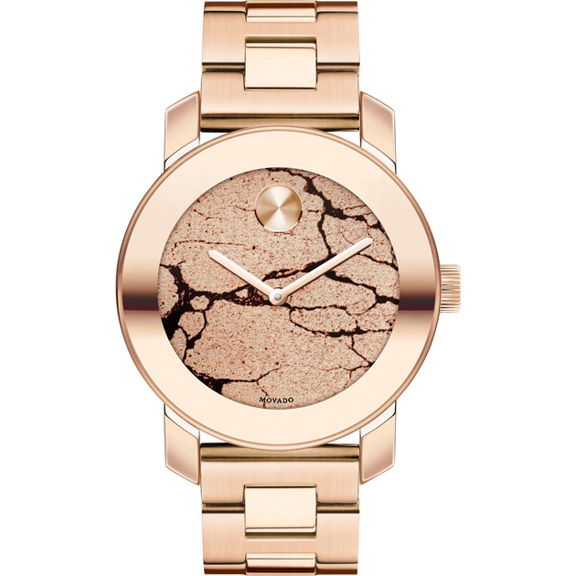 This wonderful watch by Movado features beautiful blush tones with a unique crackle glitter dial. From the Bold collection. Rose gold-tone crackle glitter dial with signature dot at twelve o’clock, two hands and Movado logo.