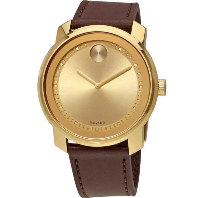 Movado’s sleek design and precision performance makes this Bold gold-tone mesh bracelet watch a thing of beauty. Gold-tone stainless steel mesh bracelet. Gold-tone dial with signature dot at twelve o’clock, two hands and Movado logo.
