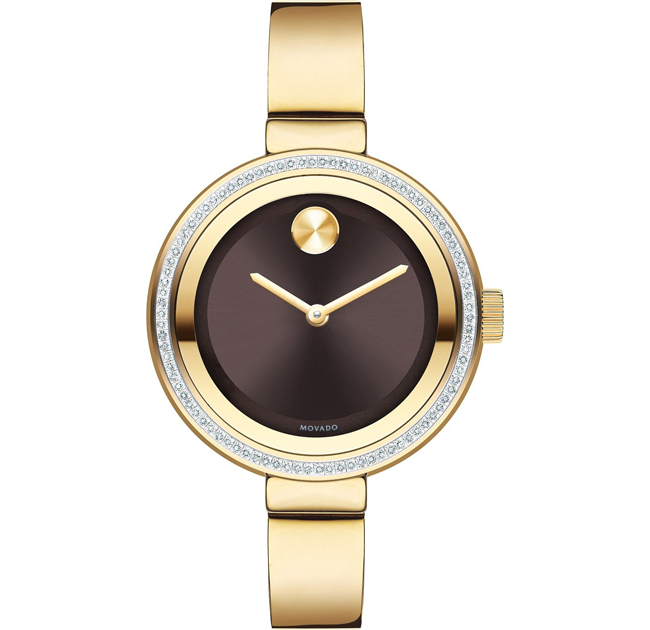 A fine leather strap matches the dark dial of this quality timepiece from Movado’s Bold collection. Black bull hide leather strap with black ion-plated stainless steel buckle closure. Round black TR90 and stainless steel case, 42mm. Black dial with signature dot at twelve o’clock, two hands and Movado logo. Swiss quartz movement. Water resistant to 30 meters