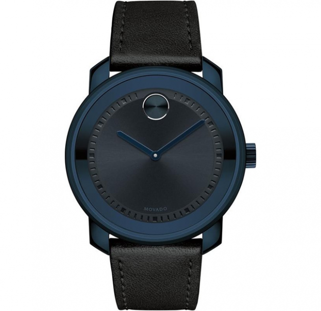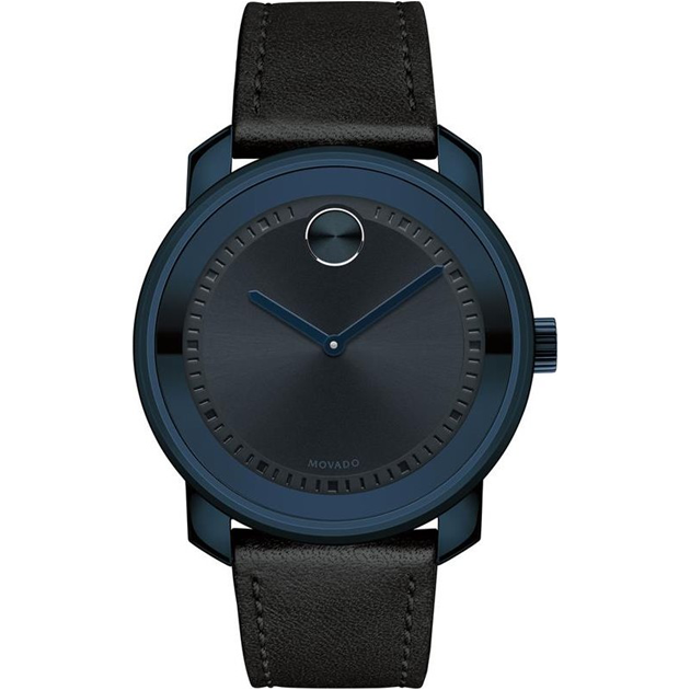Blue IP stainless steel case with a black leather strap. Fixed bezel. Blue dial with blue-tone hands. Minute markers around the outer rim.