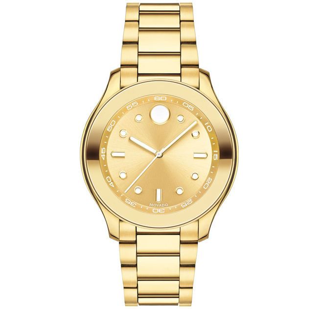 Mid-size Movado BOLD Sport watch, 38 mm rose gold ion-plated stainless steel case with extended sport lugs, rose gold-toned sunray 3-hand dial with matching Arabic minute reflector ring, signature dot and applied dot/stick markers, rose gold ion-plated stainless steel link bracelet with push-button deployment clasp.
