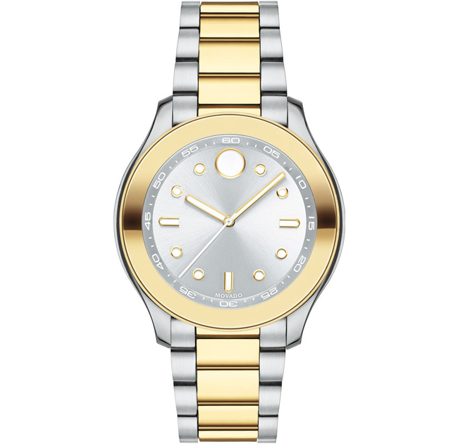 This stainless steel sport watch featuring a white silicone strap is both sleek and sophisticated, from the Bold collection by Movado. White silicone strap with stainless steeel buckle closure. Round stainless steel case, 38mm. Silver-tone sunray dial with Arabic minute reflector ring, applied dot and stick indices, three hands and signature dot marker. Swiss quartz movement. Water resistant to 30 meters