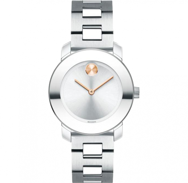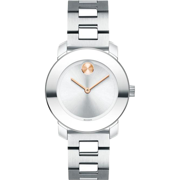 Smaller mid-size Movado BOLD watch, 30 mm stainless steel case, K1 crystal with a ring of highly reflective silver-toned metallization, silver-toned sunray dial with rose gold-toned hands and sunray dot, stainless steel link bracelet with deployment clasp.