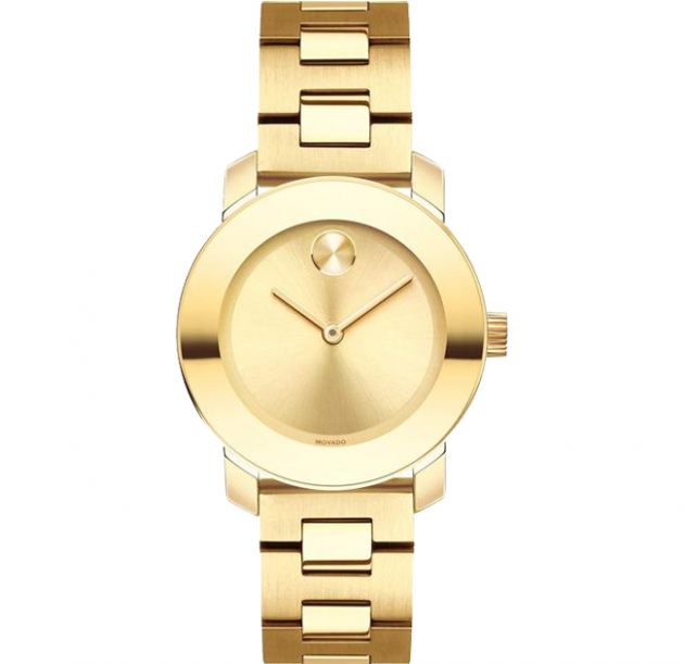 Smaller mid-size Movado BOLD watch, 30 mm yellow gold ion-plated stainless steel case, K1 crystal with a ring of highly reflective yellow gold-toned metallization, yellow gold-toned sunray dial with matching hands and sunray dot, yellow gold ion-plated stainless steel link bracelet with deployment clasp.