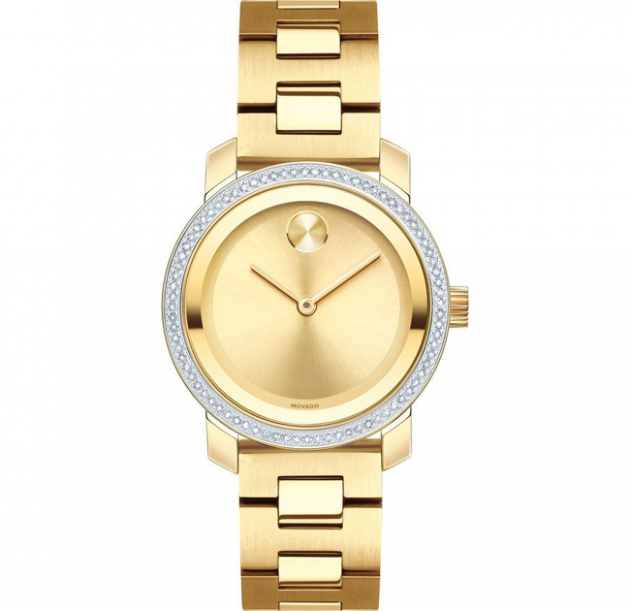 Yellow gold ion-plated stainless steel case and bracelet. Fixed, diamond set yellow gold ion-plated bezel set with 80 diamonds. Gold dial with yellow gold-tone hands. The Movado dot appears at the 12 o’clock position.