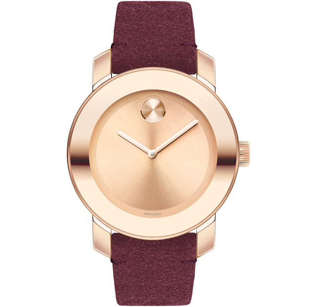 Mid-size Movado BOLD watch with blue suede strap, 36 mm stainless steel case, K1 crystal with a ring of highly reflective silver-toned metallization, silver-toned sunray dial with rose gold-toned hands and sunray dot, stainless steel buckle.