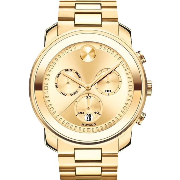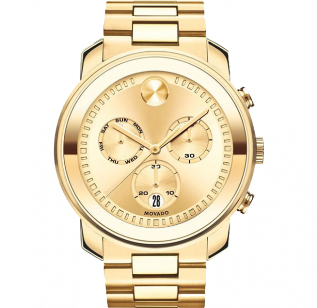 Large Movado BOLD chronograph, 48 mm bead blasted yellow gold ion-plated stainless steel case, K1 crystal with a ring of highly reflective gold metallization, gold-toned dial with matching subdials, sunray dot, hands and stamped hour/minute index, and date display, yellow gold ion-plated stainless steel link bracelet with push-button deployment clasp.