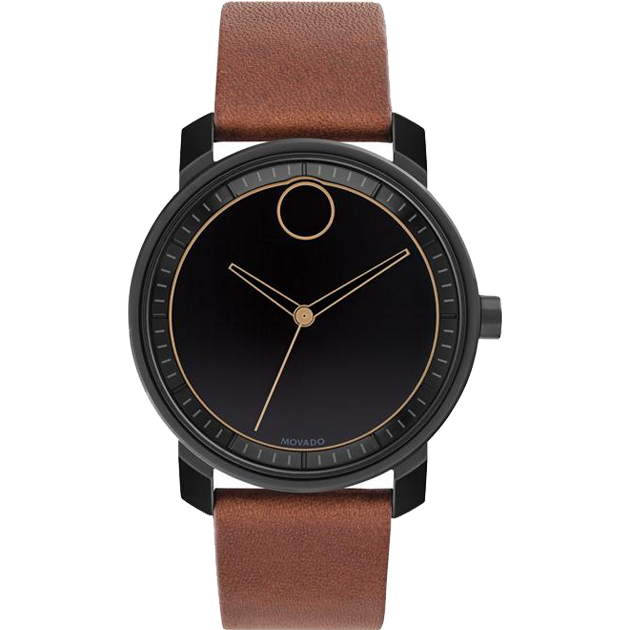 Large Movado BOLD watch, thin 41 mm ion-plated black stainless steel case, K1 crystal with a ring of highly reflective black metallization with black hour index, black dial with reflective polished black dot and hands, metallic brown second hand, cognac leather strap with ion-plated black stainless steel buckle.