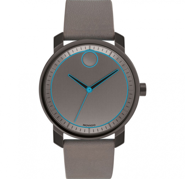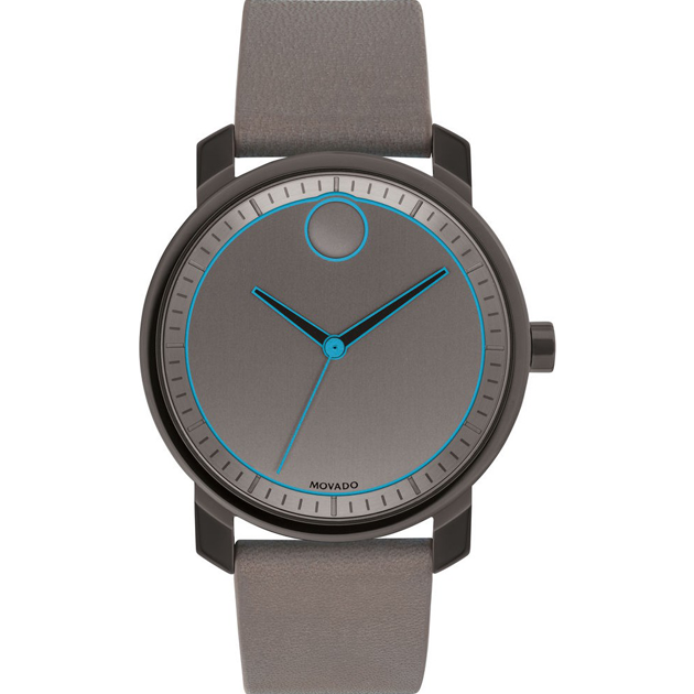 Large Movado BOLD watch, thin 41 mm ion-plated grey stainless steel case, K1 crystal with a ring of highly reflective grey metallization with grey hour index, dark gunmetal dial with reflective polished dark gunmetal dot and hands, glossy blue second hand, grey leather strap with ion-plated grey stainless steel buckle.