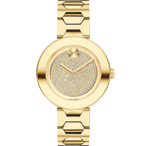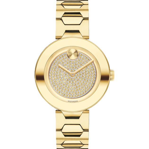 Mid-size Movado BOLD watch, 32 mm yellow gold ion-plated stainless steel case, K1 crystal with a ring of highly reflective yellow gold-toned metallization, crystal pave dial with gold-toned dot and hands, yellow gold ion-plated stainless steel T-bar link bracelet with push-button deployment clasp.