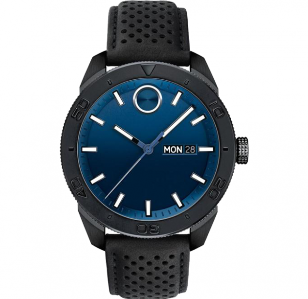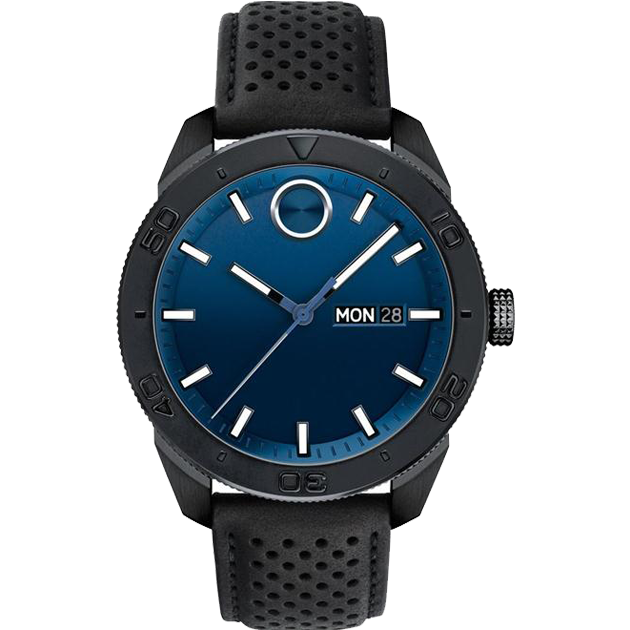 Large Movado BOLD Sport watch, 43.5 mm black ion-plated stainless steel case with screw-down crown and unidirectional bezel, blue 3-hand dial with matching metallic minute reflector ring, signature dot, white lumi-filled markers, and day/date display, black leather perforated strap and black ion-plated stainless steel buckle.