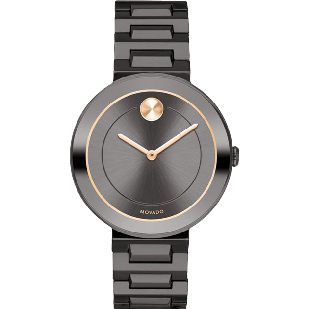 Mid-size Movado BOLD watch, 34 mm gunmetal ion-plated stainless steel case, K1 crystal, gunmetal-toned dial with matching outer ring, carnation pink-toned dot and hands, gunmetal ion-plated stainless steel refined link bracelet with push-button deployment clasp.
