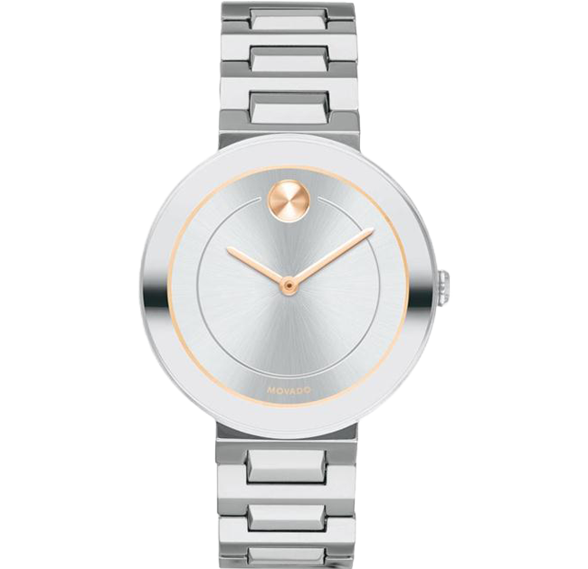 Mid-size Movado BOLD watch, 34 mm pale gold ion-plated stainless steel case, K1 crystal, pale gold-toned dial with matching frosted-textured outer ring, pale gold-toned dot and hands, pale gold ion-plated stainless steel link bracelet with push-button deployment clasp.