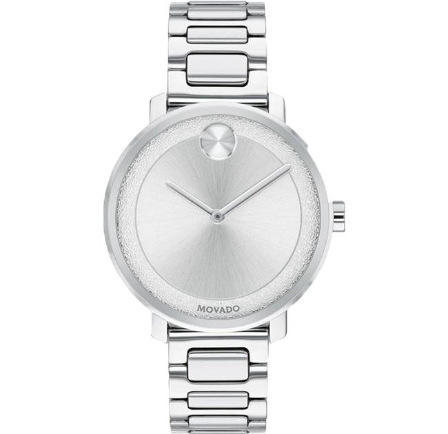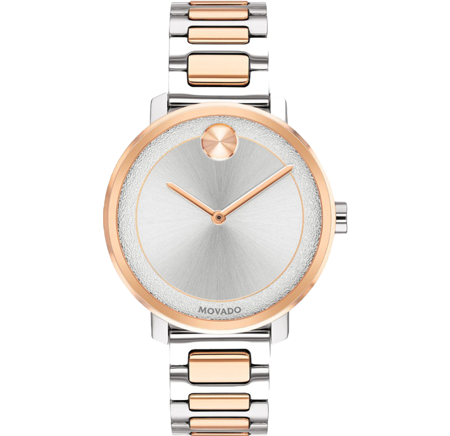 Mid-size Movado BOLD watch, 34 mm rose gold ion-plated stainless steel case, K1 crystal, rose gold-toned dial with matching frosted-textured outer ring, rose gold-toned dot and hands, rose gold ion-plated stainless steel link bracelet with push-button deployment clasp.