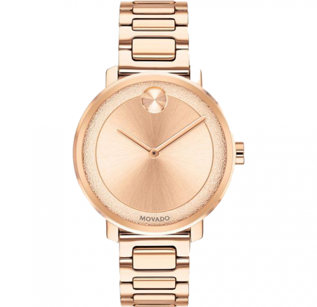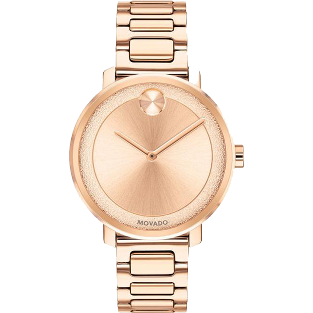 Mid-size Movado BOLD watch, 34 mm rose gold ion-plated stainless steel case, K1 crystal, rose gold-toned dial with matching frosted-textured outer ring, rose gold-toned dot and hands, rose gold ion-plated stainless steel link bracelet with push-button deployment clasp.