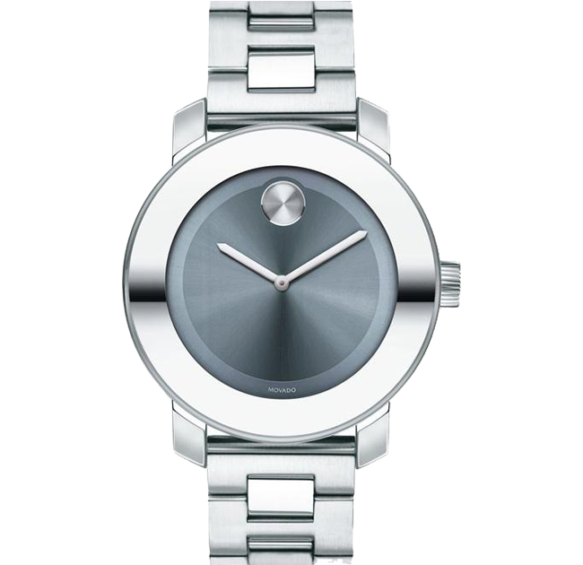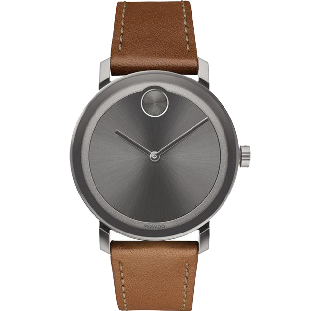 Large Movado BOLD Evolution watch, thin 40 mm blue ion-plated stainless steel case, K1 crystal, blue sunray dial with matching sunray dot/hands, top-stitched beige leather strap with blue ion-plated stainless steel buckle.