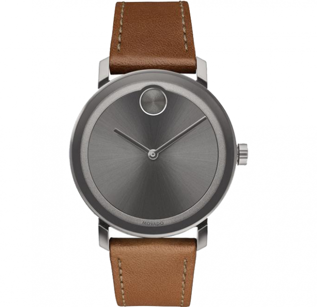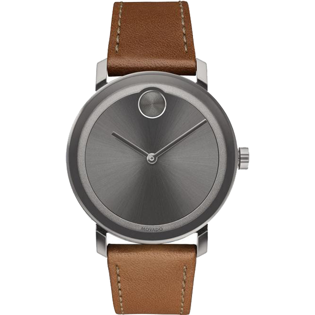 Large Movado BOLD Evolution watch, thin 40 mm gunmetal ion-plated stainless steel case, K1 crystal, gunmetal sunray dial with matching sunray dot/hands, top-stitched cognac leather strap with gunmetal ion-plated stainless steel buckle.