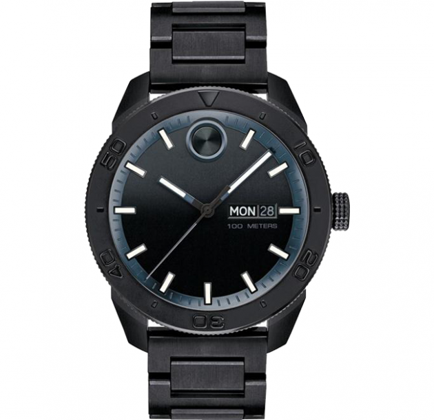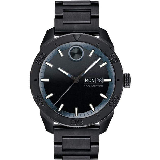 Large Movado BOLD Sport watch, 43.5 mm black ion-plated stainless steel case with screw-down crown, unidirectional black ion-plated stainless steel bezel; black 3-hand dial with metallic grey-blue minute reflector ring, signature dot, white lumi-filled markers, day/date display; black ion-plated stainless steel link bracelet with push-button deployment clasp.