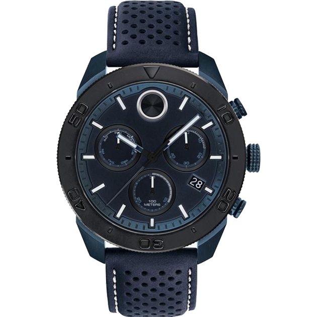 Large Movado BOLD Sport chronograph watch, 44.5 mm navy ion-plated stainless steel case with screw-down crown and unidirectional bezel, navy chronograph dial with matching metallic minute reflector ring, signature dot, white lumi-filled markers, and date display, navy leather perforated strap and navy ion-plated stainless steel buckle.