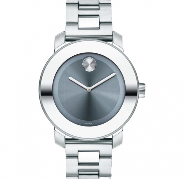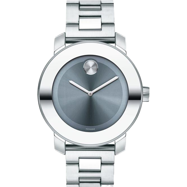 Mid-size Movado BOLD watch, 36 mm stainless steel case, K1 crystal with a ring of highly reflective silver-toned metallization, blue-steel sunray dial with silver-toned sunray dot and hands, stainless steel link bracelet with push-button deployment clasp.