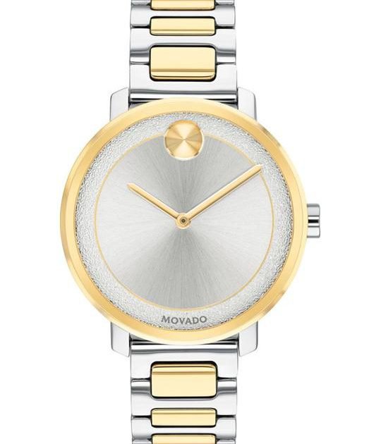 Mid-size Movado BOLD watch, 34 mm stainless steel and yellow gold ion-plated case, K1 crystal, silver-toned dial with matching frosted-textured outer ring, yellow gold-toned dot and hands, two-toned stainless steel link bracelet with push-button deployment clasp.