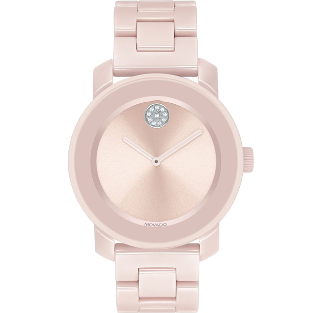 Mid-size Movado BOLD watch, 36 mm black ceramic and stainless steel case, K1 crystal with a ring of highly reflective black-toned metallization, black dial with clear crystal-set dot and black-toned hands, black ceramic and stainless steel link bracelet with push-button deployment clasp.