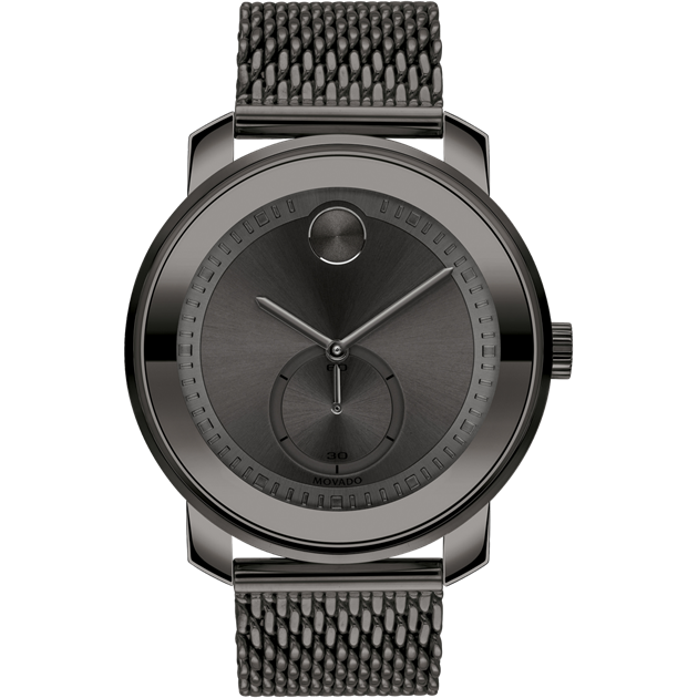 Movado BOLD, 45 mm gunmetal ion-plated stainless steel case and mesh bracelet with a gunmetal-toned dial.