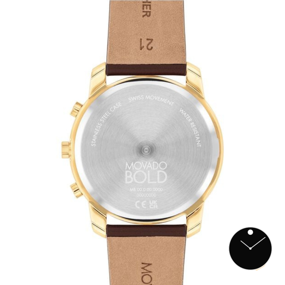 Đồng hồ bấm giờ Movado Trend Element dành cho nam, vỏ PVD vàng vàng 42mm và dây đeo bằng da màu sô cô la, mặt đồng hồ vàng vàng, tinh thể khoáng K1, Bộ máy bấm giờ Thụy Sĩ