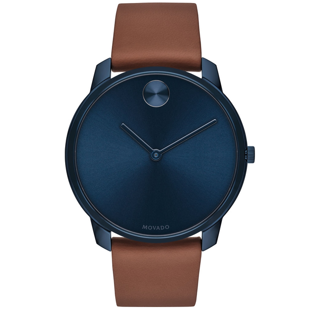 Movado BOLD, 42 mm black ion-plated stainless steel case with a black-toned dial on black leather strap.