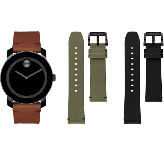 Movado BOLD, 35 mm grey ion-plated stainless steel case with a grey-toned dial on earth grey leather strap.