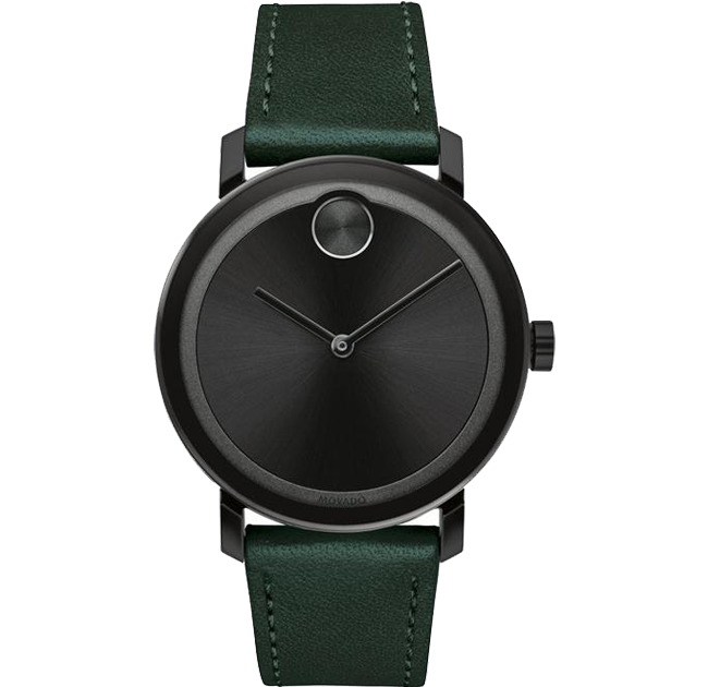 Large Movado BOLD Evolution watch, thin 40 mm black ion-plated stainless steel case, K1 crystal, black dial with matching sunray dot/hands, top-stitched grey leather strap, black ion-plated stainless steel buckle.