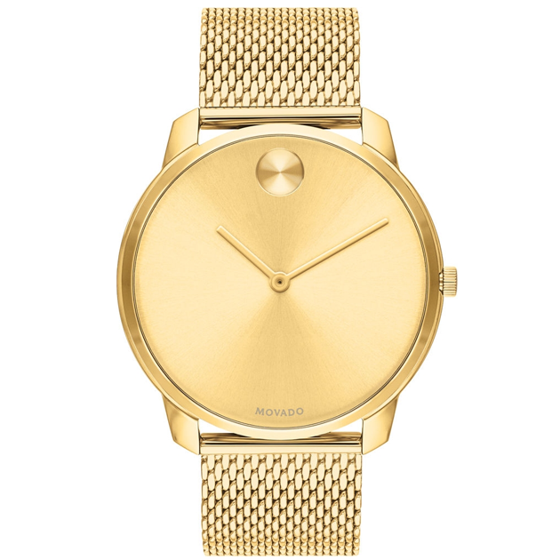 Movado BOLD, 42 mm stainless steel case with silver-toned dial on stainless steel mesh bracelet.