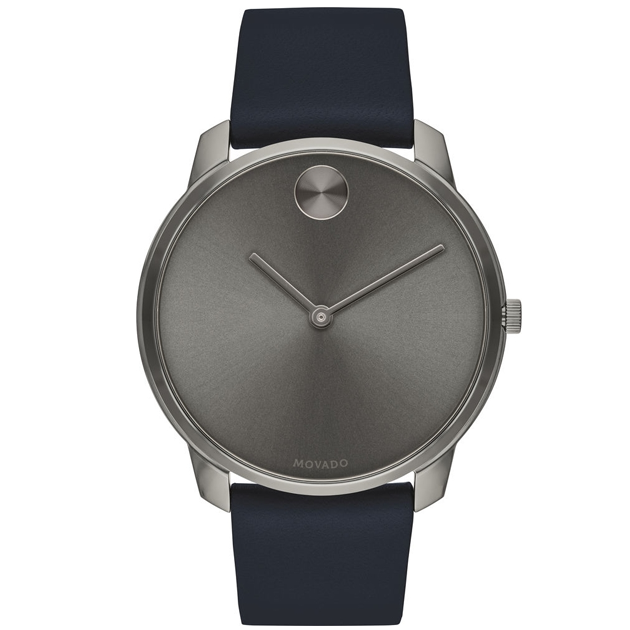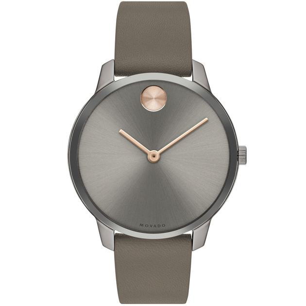 Movado BOLD, 35 mm pale rose gold ion-plated stainless steel case with a pale rose gold-toned dial on blush leather strap.